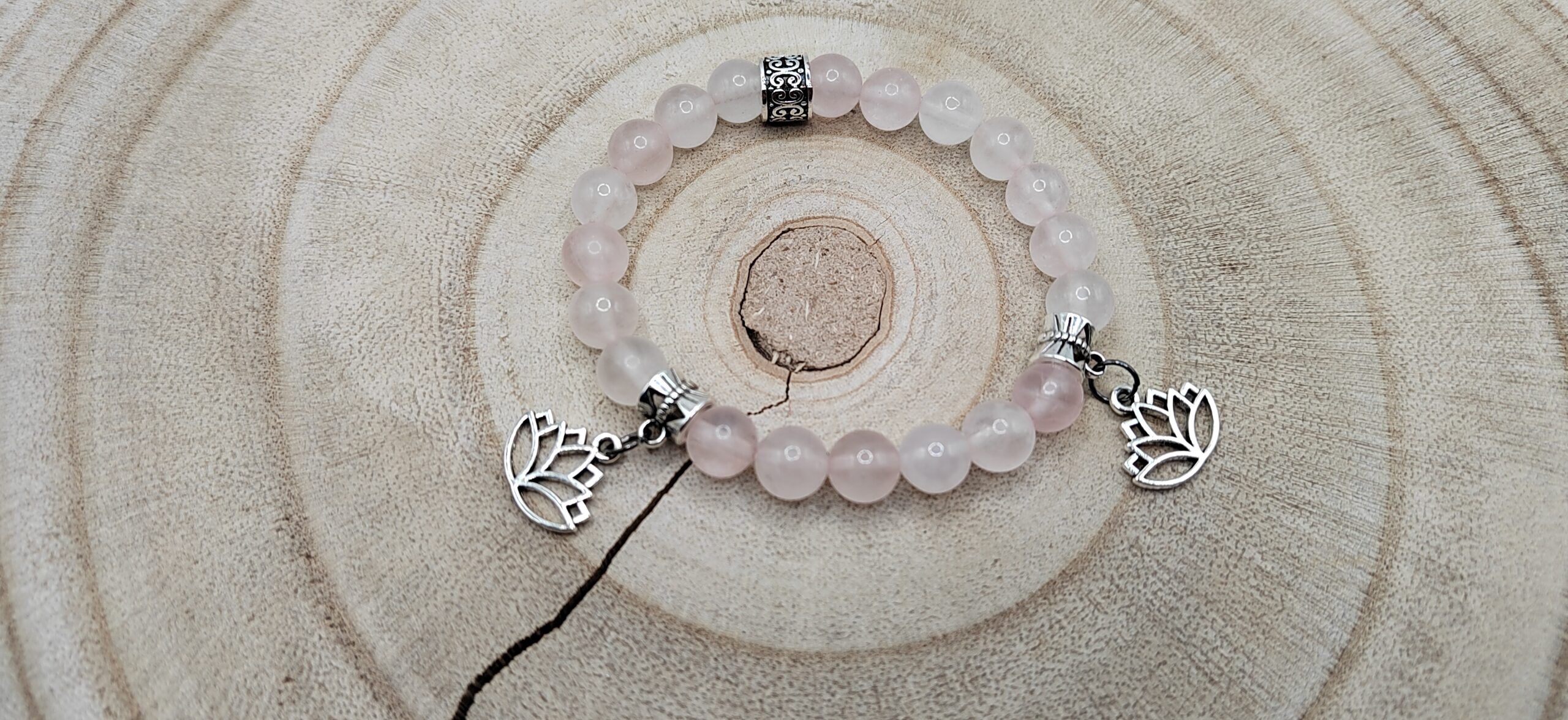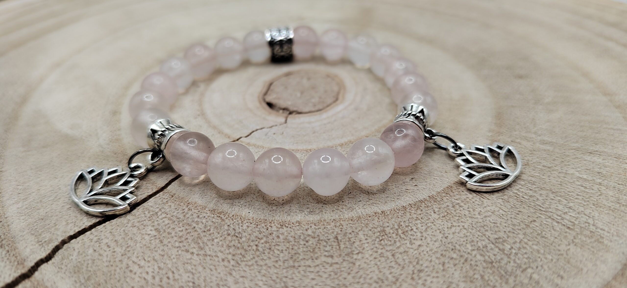 Bracelet 18 cm en pierres naturelles composé de Quartz rose et de jolies breloques fleurs de Lotus.