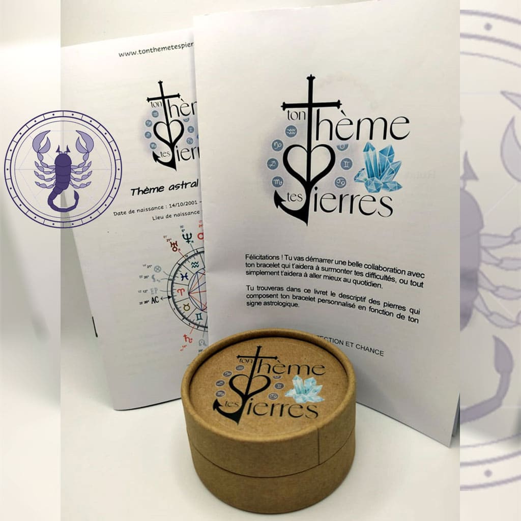 Nos packs permettent d’acheter en même temps un thème astral et un bracelet personnalisé de ton signe astral, tout en bénéficiant d’une réduction pour cet achat simultané. Si tu es du signe zodiacal du Scorpion, profite de cet avantage en commandant ton bracelet personnalisé avec ton thème !